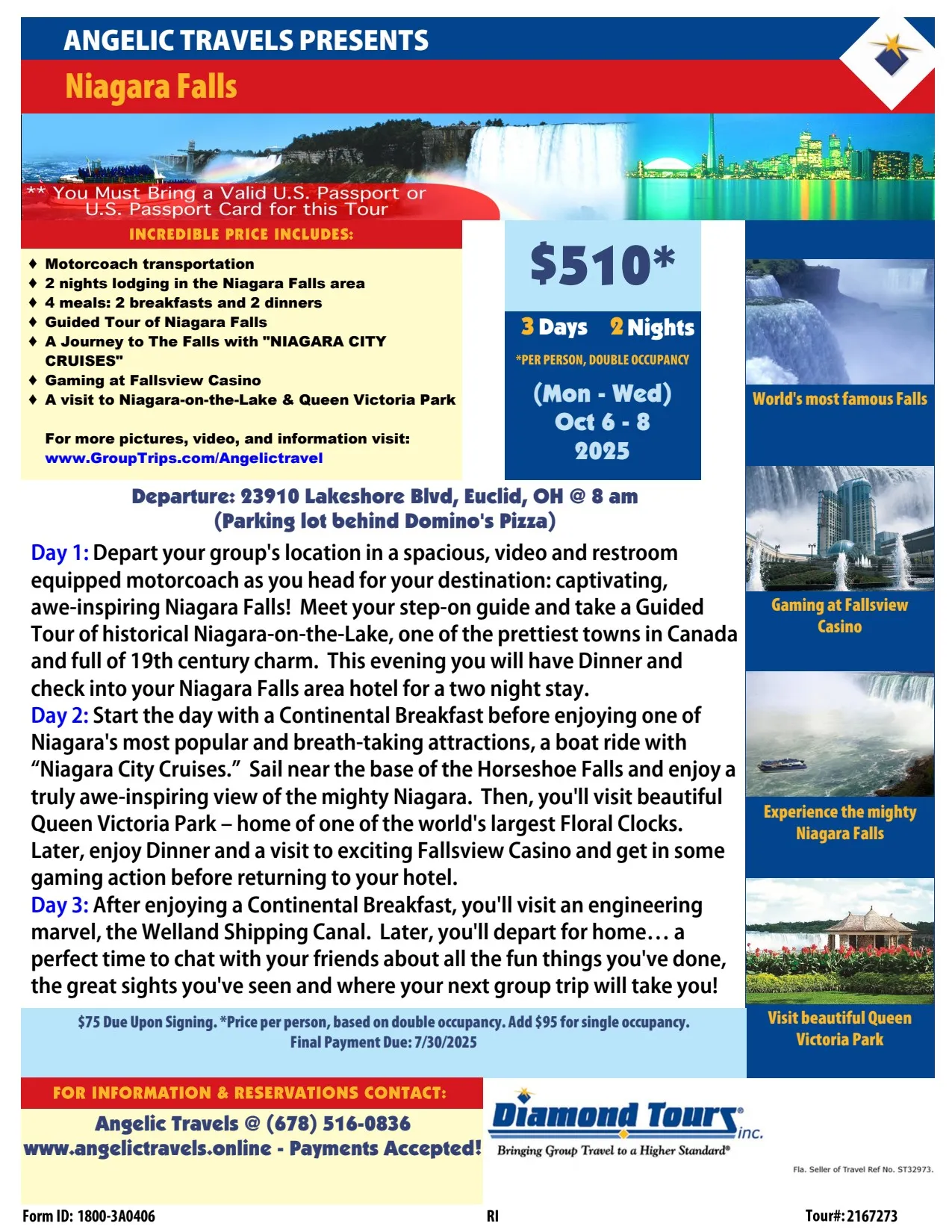 Angelic Travel Presents: NIAGARA FALLS (YOU MUST BRING A VALID PASSPORT OR CARD)
